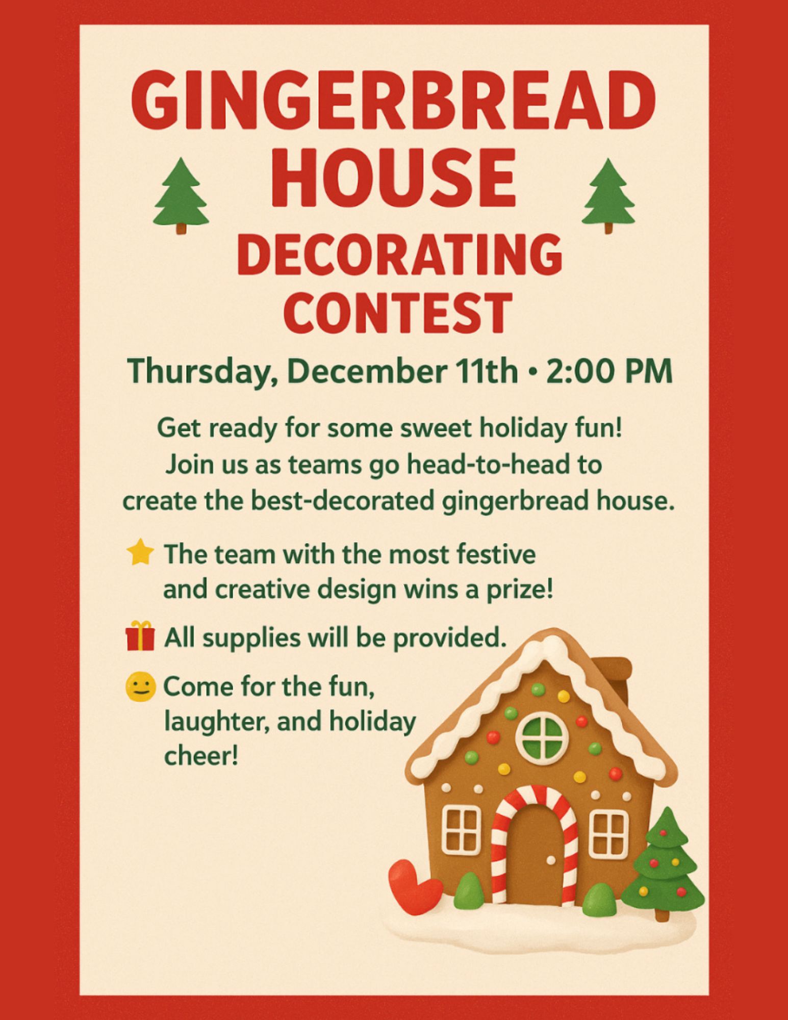 Come join the fun, share in the laughter, and immerse yourself in the joyful spirit of the season at Marion Woods’ Gingerbread House Decorating Contest!